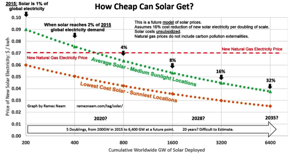 These staggering numbers, in combination with an exponential decline in photovoltaic solar energy costs ($ per watt price of solar cells), put us on track to meet between 50 percent and 100 percent of the world’s energy production from solar (and other renewables) in the next 20 years.